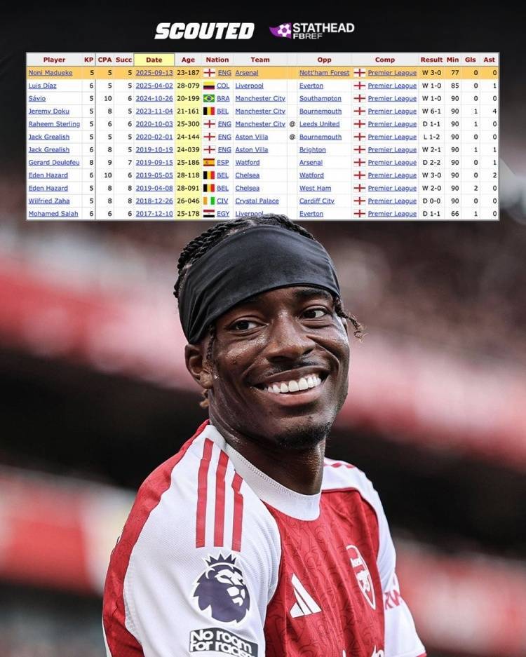 单场英超5次过人5次关键传球5次带球进禁区 马杜埃凯是阿森纳首人